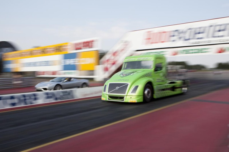 It was a fierce contest with �Mean Green’, a converted Volvo VN featuring the very latest hybrid technology from Volvo Trucks, challenging the Ferrari sports car driven by Henrik Appelholm.