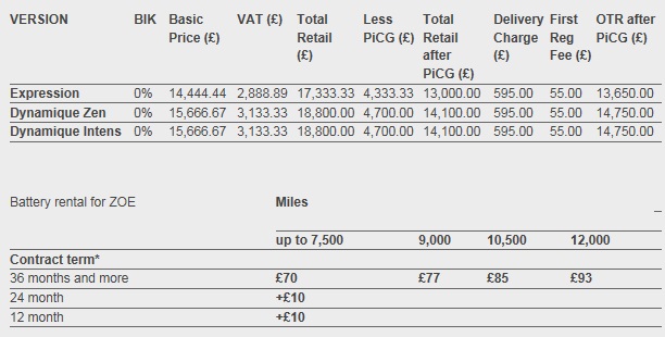 UK pricing and specification for Renault’s flagship Z.E. model, ZOE, was announced at the Geneva Motorshow in 2012, with an on-the-road price of £13,650 (after the UK Plug-In Car Grant), comparable to that of a diesel-engined New Clio.