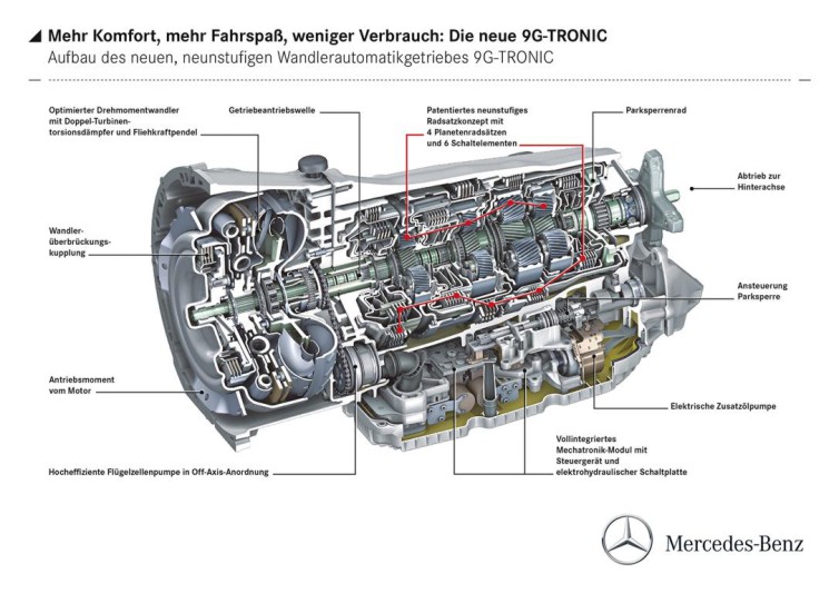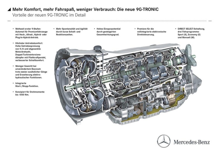 Den besonderen Schaltkomfort der neuen 9G-TRONIC – einer der Entwicklungsschwerpunkte und markentypische Eigenschaft einer Automatik von Mercedes-Benz - sichert ein umfangreiches Maßnahmenpaket. Dazu gehört die neuartige Direktsteuerung, die kaum wahrnehmbare, kurze Schaltungen ermöglicht. Die Kombination aus Doppeltorsionsdämpfer und Fliehkraft-pendeltechnologie im Wandler sorgt für ausgezeichneten Antriebskomfort. Zusammen mit der erweiterten Spreizung können nun höhere Geschwindigkeiten bei niedrigeren Motordrehzahlen mit noch mehr Komfort gefahren werden. Konkret bedeutet dies z.B. bei 120 km/h im 9. Gang lediglich ca. 1.350 U/min.