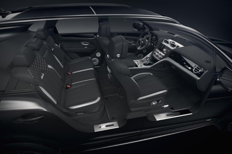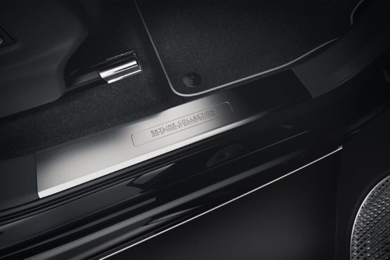 Silver accents to the bespoke Mulliner interior surround the seats and headrests. These are mirrored with the painted veneer fascias of the dashboard and door waistrails. Silver contrast stitch runs through the centre of the seats leading to an embroidered Manhattan Skyline image, which is replicated as a chrome overlay on the passenger fascia. Finishing touches of personalised treadplates and bespoke LED welcome lighting complete the unique theme for this first cross-car collection.