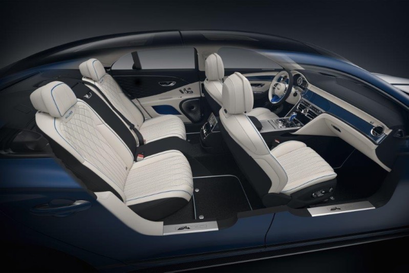 Inside the Flying Spur Miami Edition, for example, the cabin is dominated with a striking two-tone paint-matched piano veneer wrapping around the front occupants and continued into the rear door pockets with Klein Blue leather matching the exterior colour. The seats have contrast stitched bespoke quilting, Mulliner embroidery to the headrests and micro-piping in Klein Blue, all emphasising the craftsmanship in this commission. Klein Blue leather is also featured on the gear selector and the lower spoke of the steering wheel. A ‘One of Six’ treadplate plaque becomes apparent whilst entering and exiting the vehicle, displaying the vehicle exclusivity.